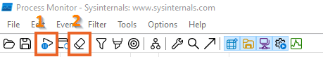 Vorbereitung: Alle Programme schließen so dass möglichst nur der Process Monitor offen bleibt. In ProcMon auf das Aufnahme-Symbol (1) klicken, um die Aufzeichnung kurz zu stoppen, und auf das Radiergummi-Symbol (2), um die Liste zu leeren.