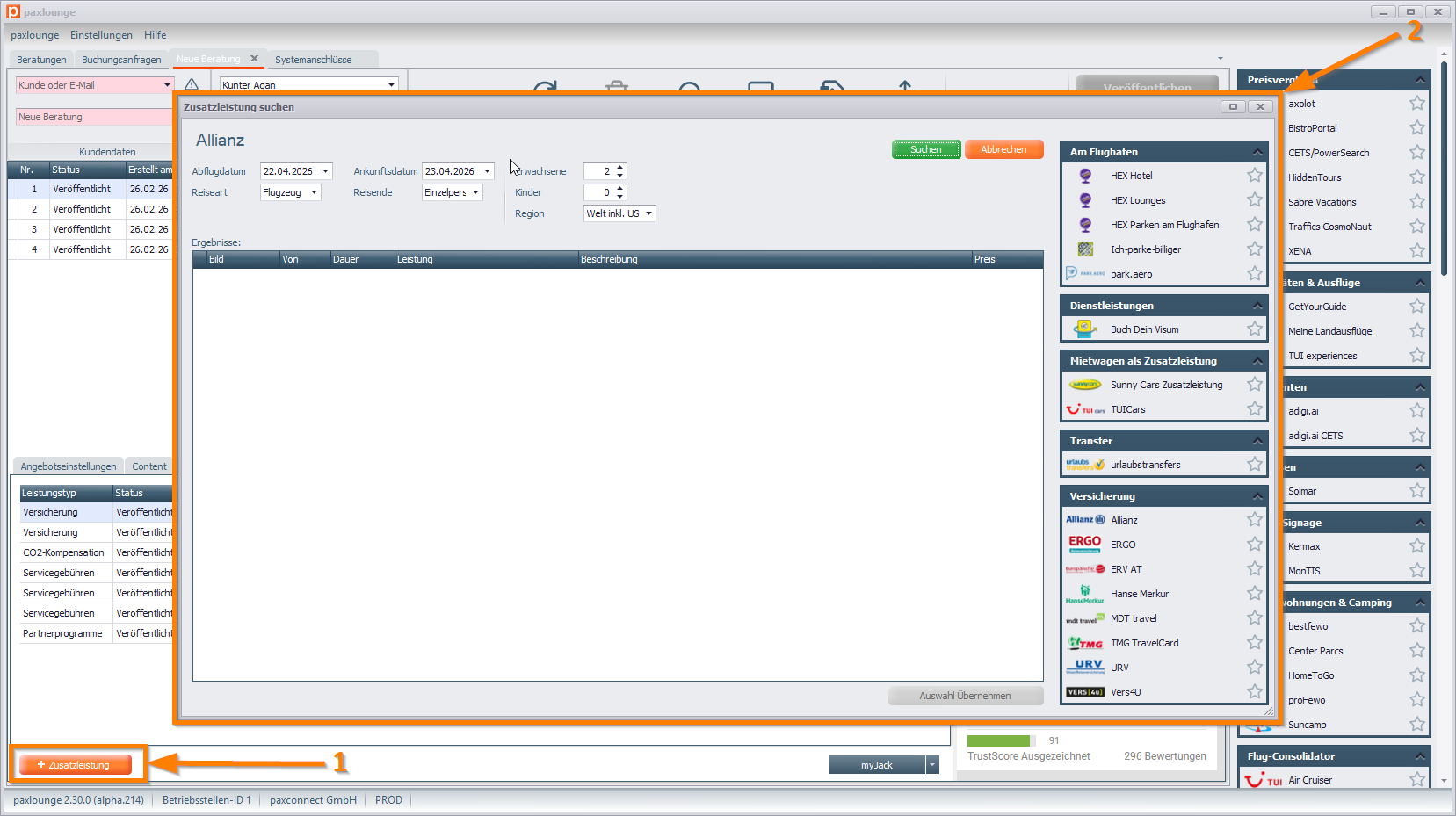Klicken Sie dazu in der Beratung unten links auf den Button Zusatzleistung (1). Dann öffnet sich das Fenster mit den Zusatzleistungen (2). Hier können Sie die gewünschte Zusatzleistung auswählen, nach Eingabe der Suchparameter suchen und dann per Doppelklick auf das passende Suchergebnis dem Angebot zuordnen.